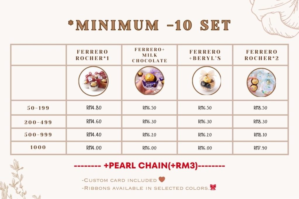 | variety | +PEARL CHAIN, FERRERO + BERYL'S (MEDIUM SIZE), FERRERO + MILK CHOCOLATE (MEDIUM SIZE), FERRERO ROCHER*1 (SMALL SIZE), FERRERO ROCHER*2 (BIG SIZE) |